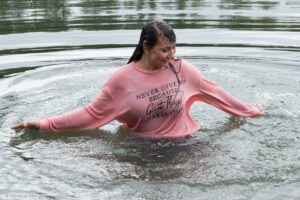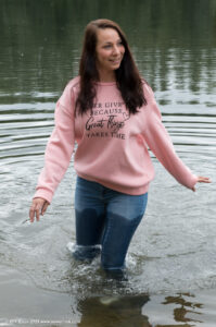 Membersite: Sandra in a lake wearing jeans, a sweatshirt and sports shoes, movie (incl. 4K) & images