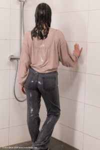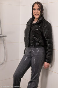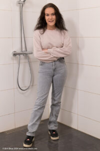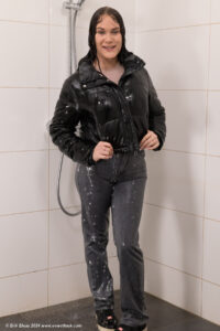 Membersite: Helena in the shower, wearing jeans, a winter coat over a sweater and sports shoes, movie (incl. 4K) & images