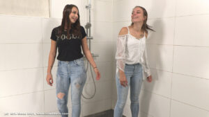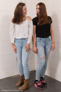 Sandra with a tshirt and sports shoes, Shannen with a white blouse and small boots.