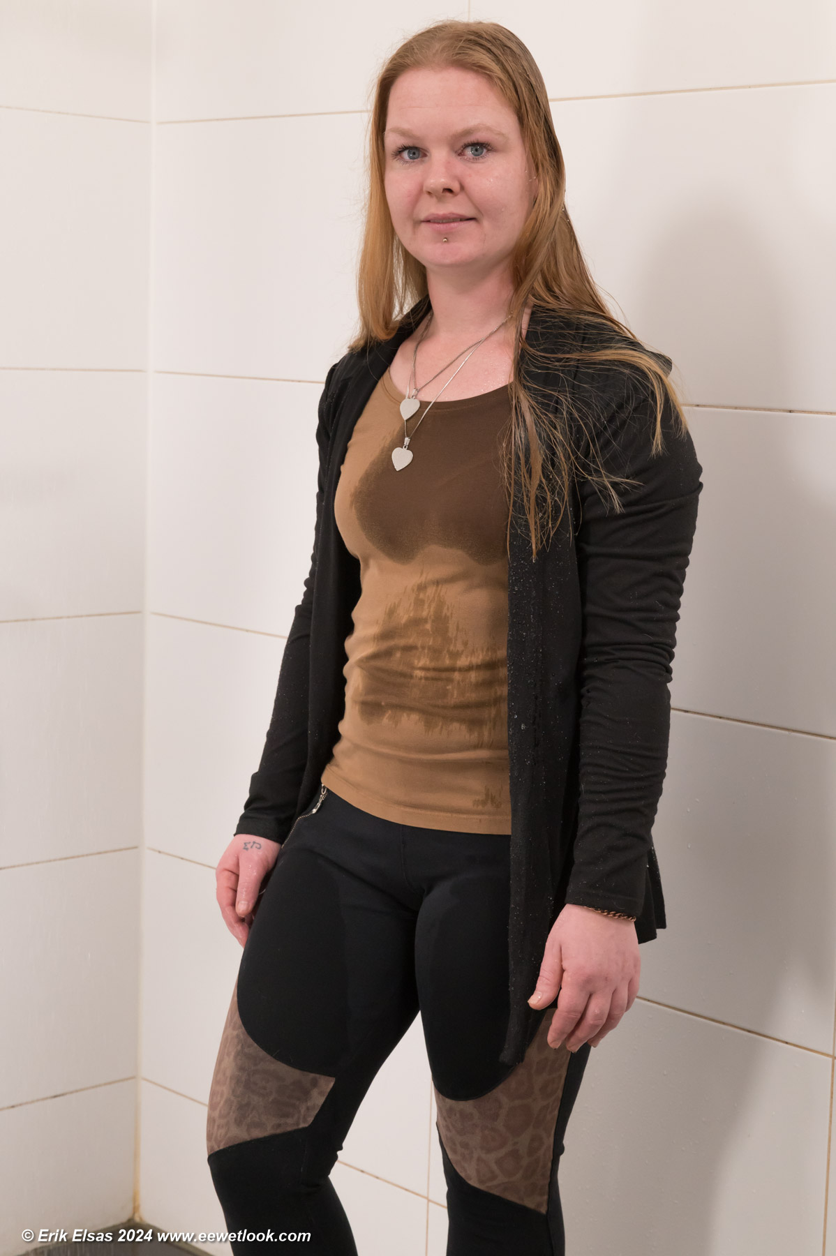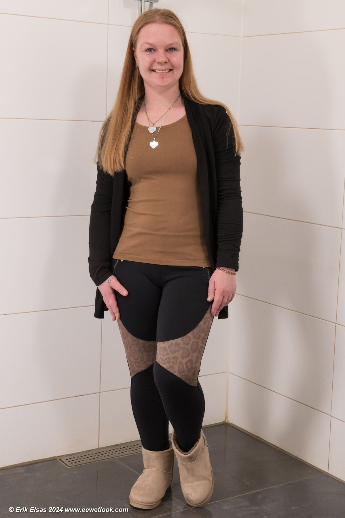 Charlotte takes a shower wearing tight pants, a cardigan over a longsleeve and ugg-style boots.