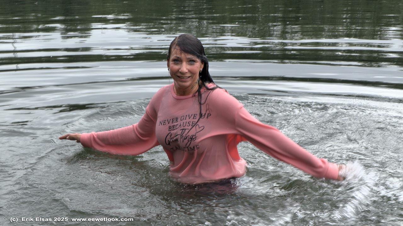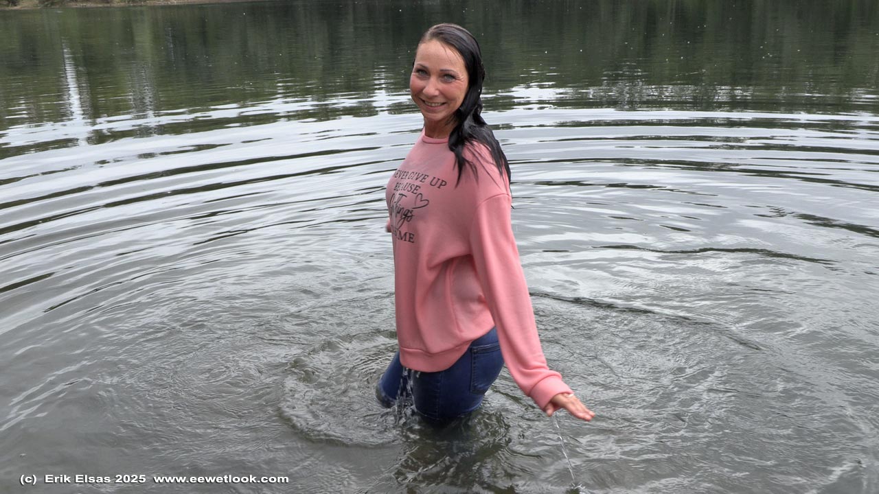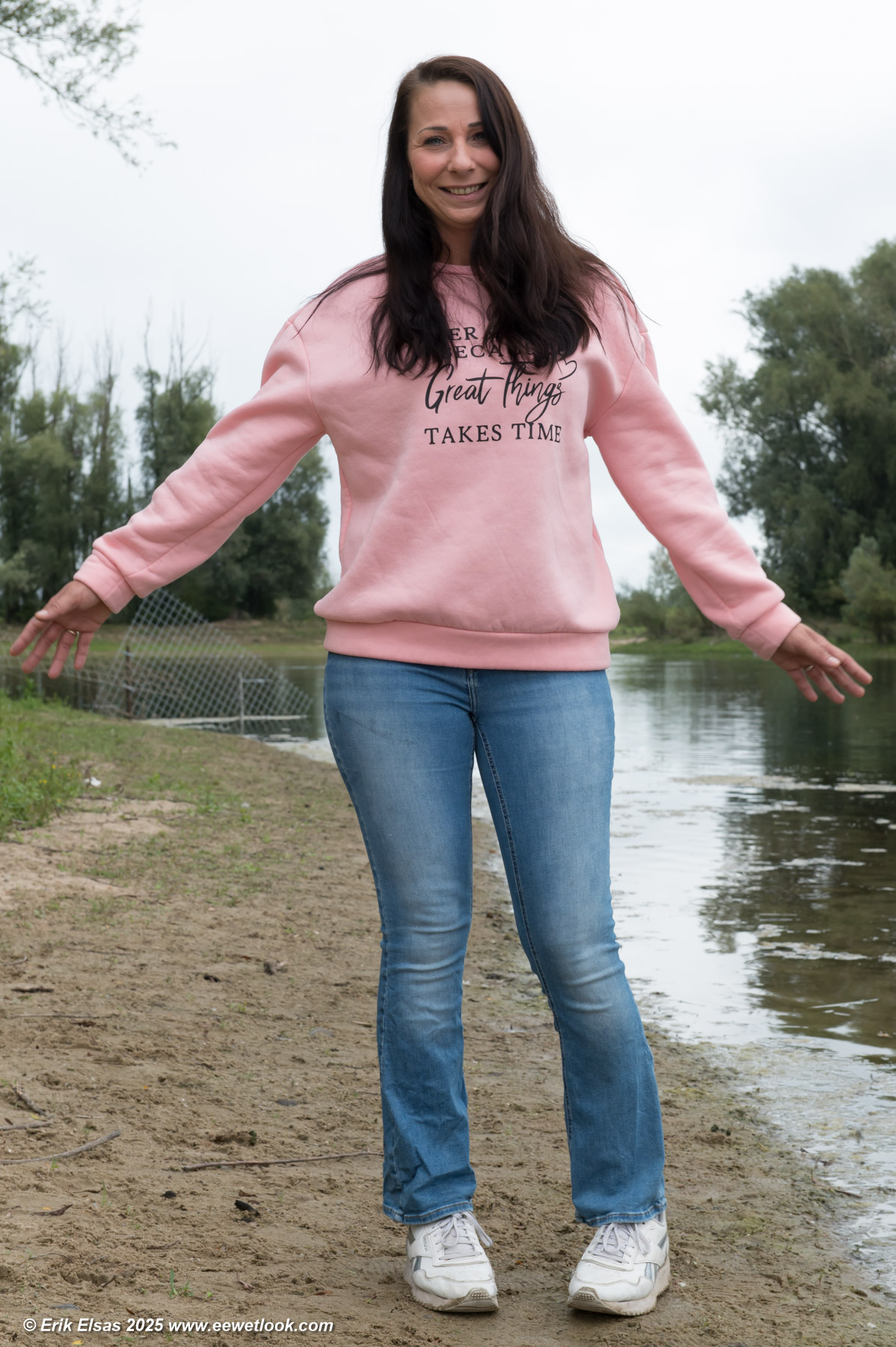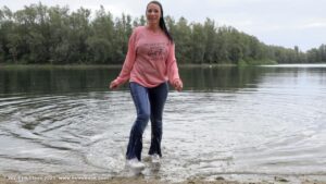 Sandra in a lake wearing jeans, a sweatshirt and sports shoes.