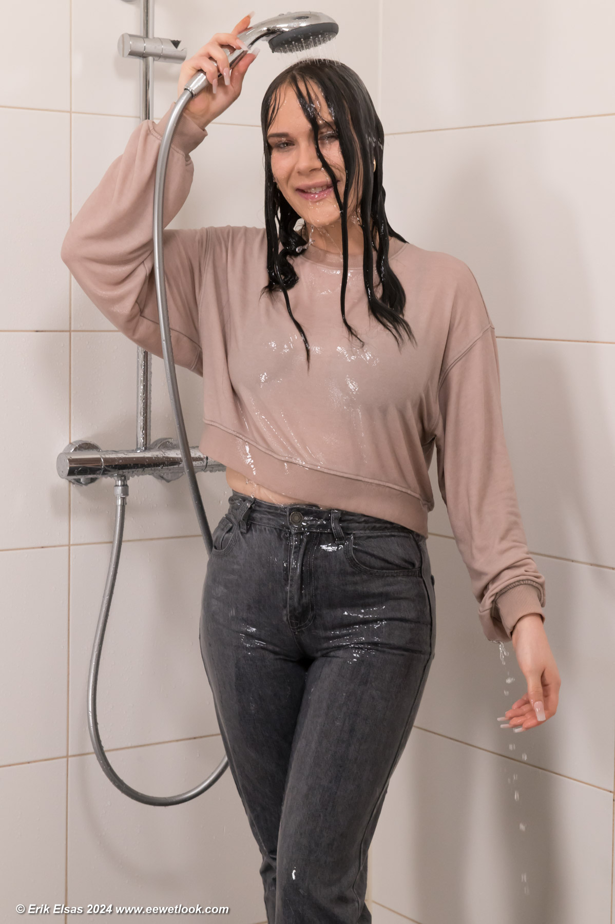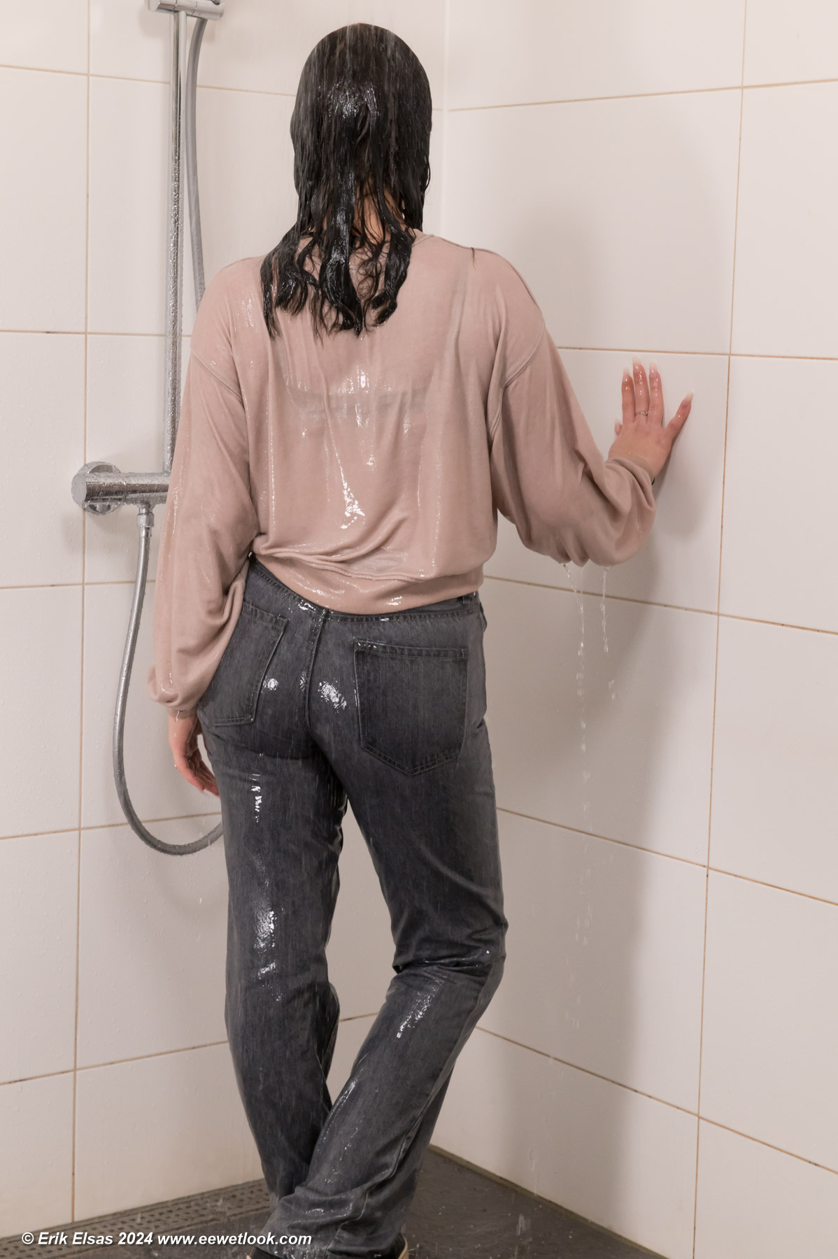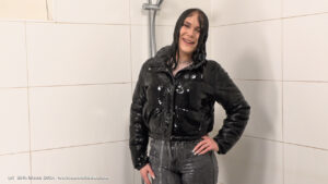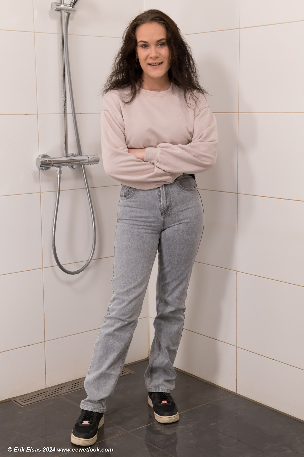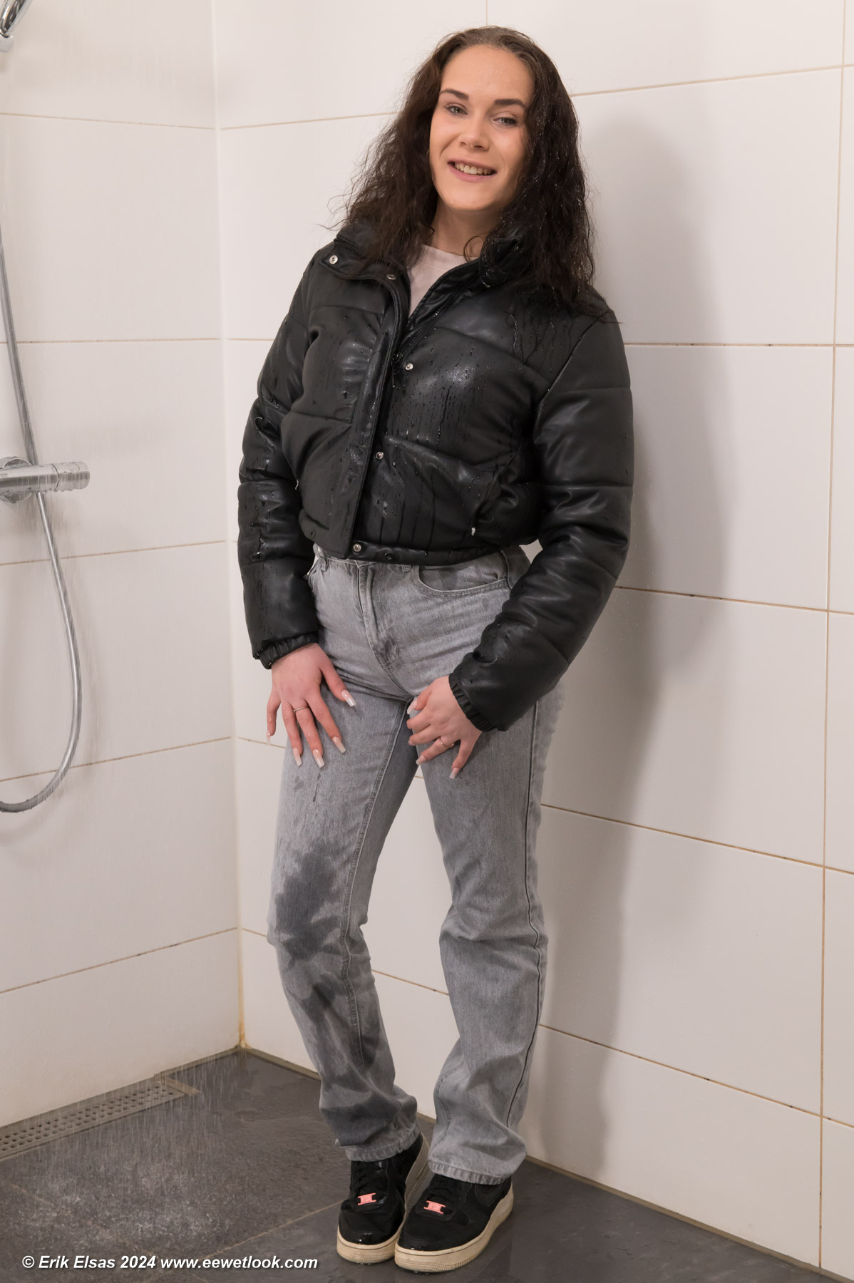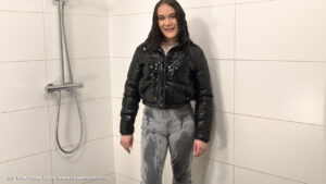 Helena in the shower, wearing jeans, a stuffed winter coat over a sweater and sports shoes.