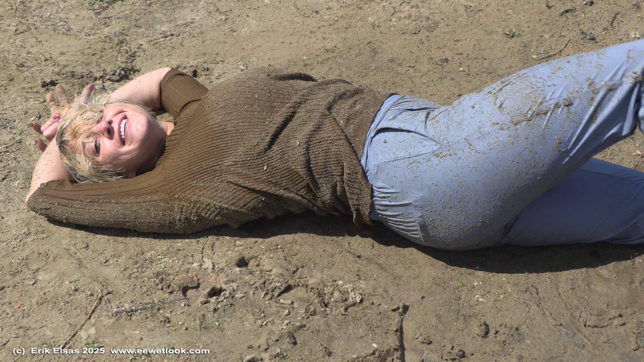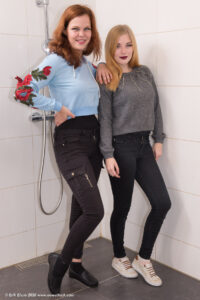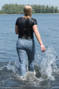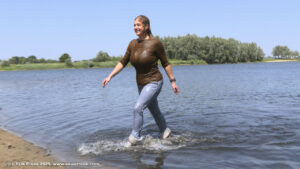 Sharon & Valentina in a lake wearing jeans and tshirts,