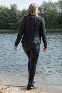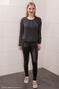 Lotje wearing black jeans, a patent leather jacket over a shirt and heels.