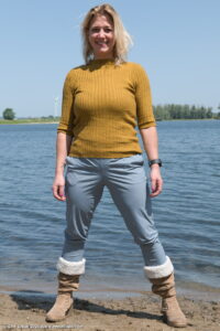 Joyce in a lake wearing pants, a sweater over a black tshirt and ugg boots.