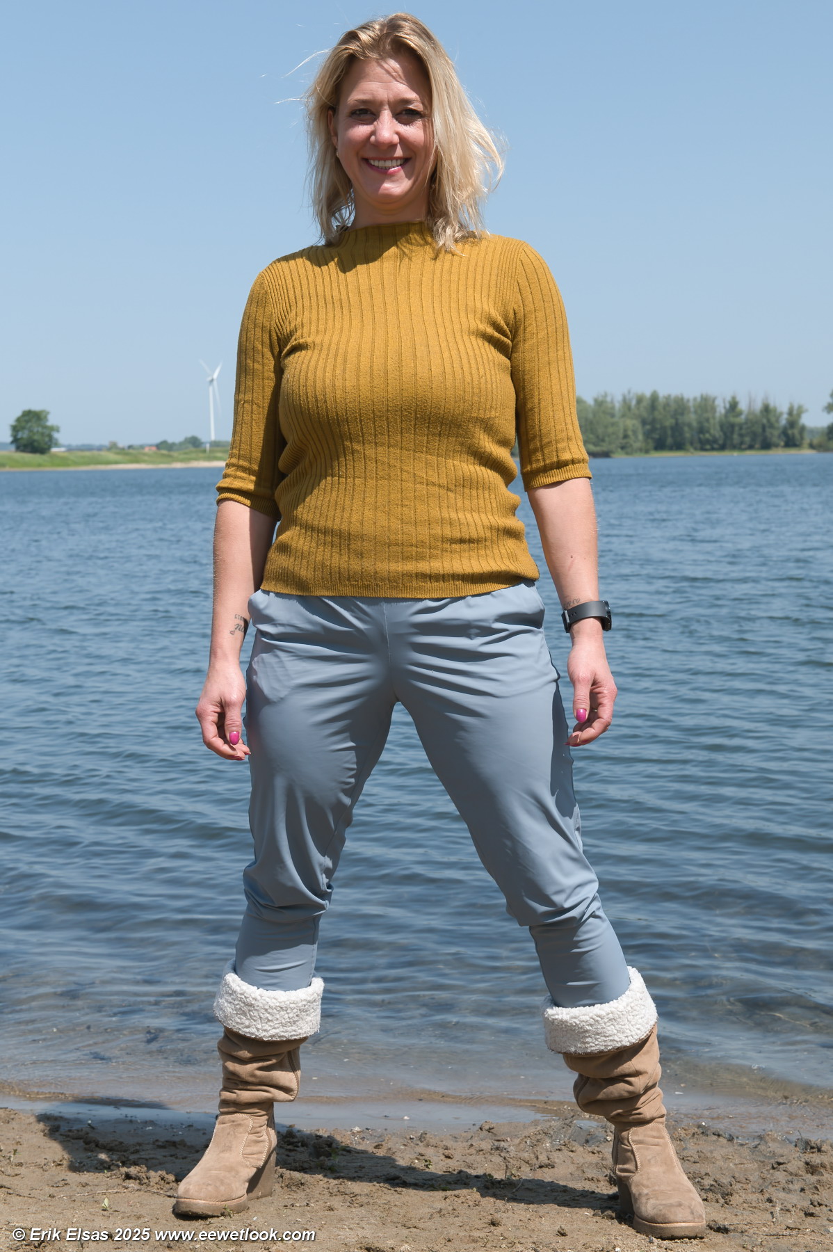 Charlotte in a lake, wearing grey jeans, a sweater and small boots with heels.