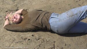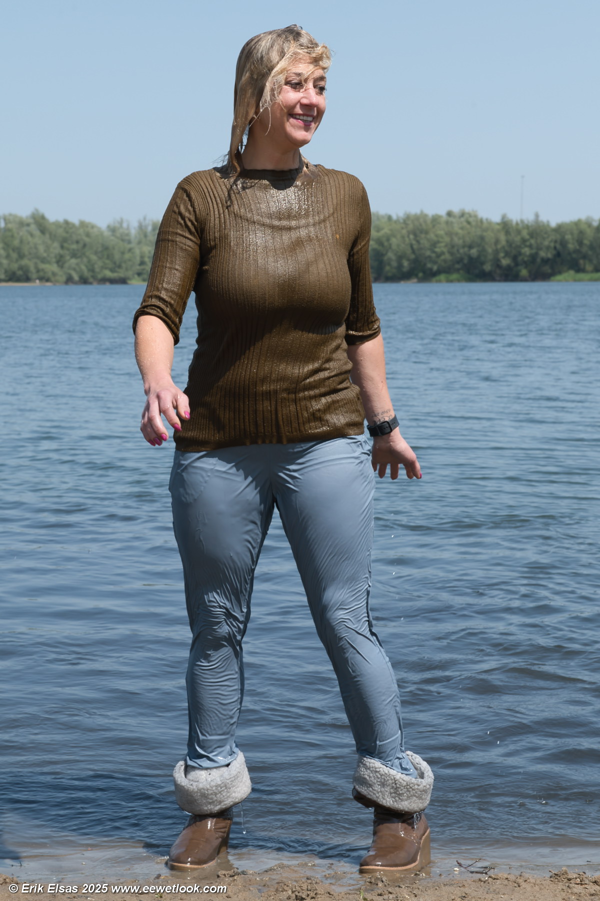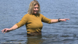 Sharon in a lake wearing jeans, a tshirt and sports shoes.