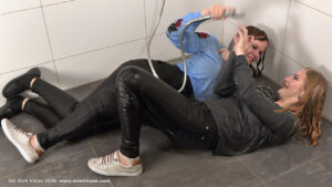 Lotje and Harley take a shower, with Lotje wearing black pants, a sweater and shoes,