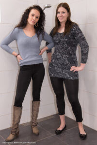 Sandra & Shannen in the shower, with Sandra wearing jeans, a longsleeve and boots,