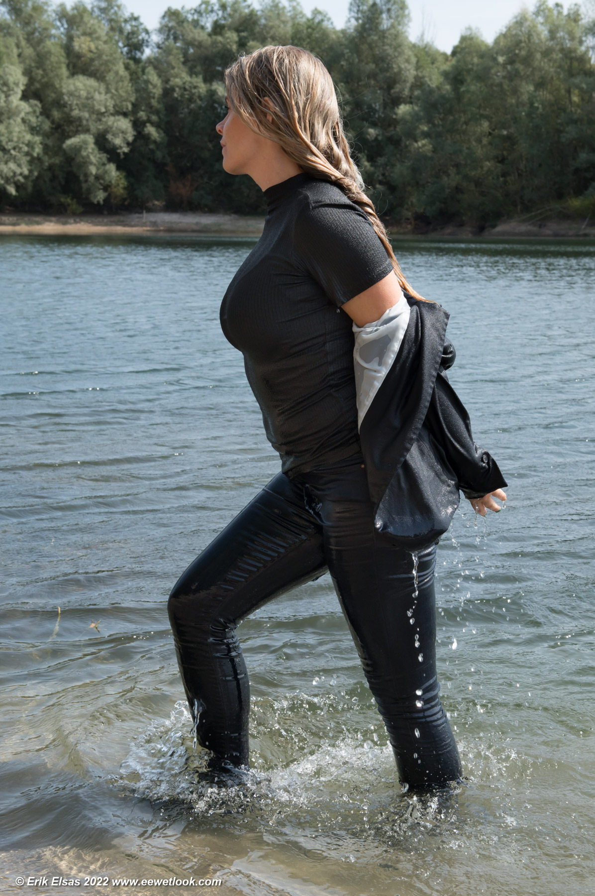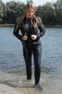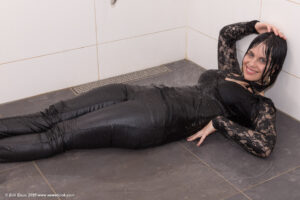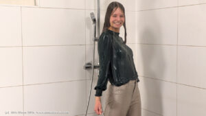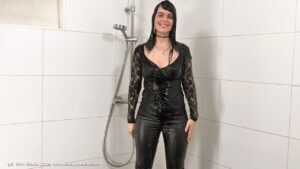 Lola takes a shower wearing patent leather pants, a longsleeve with transparent sleeves