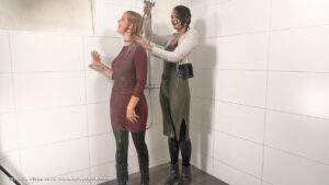 Lea takes a shower wearing a dress with a short jacket, pantyhose and small boots.