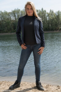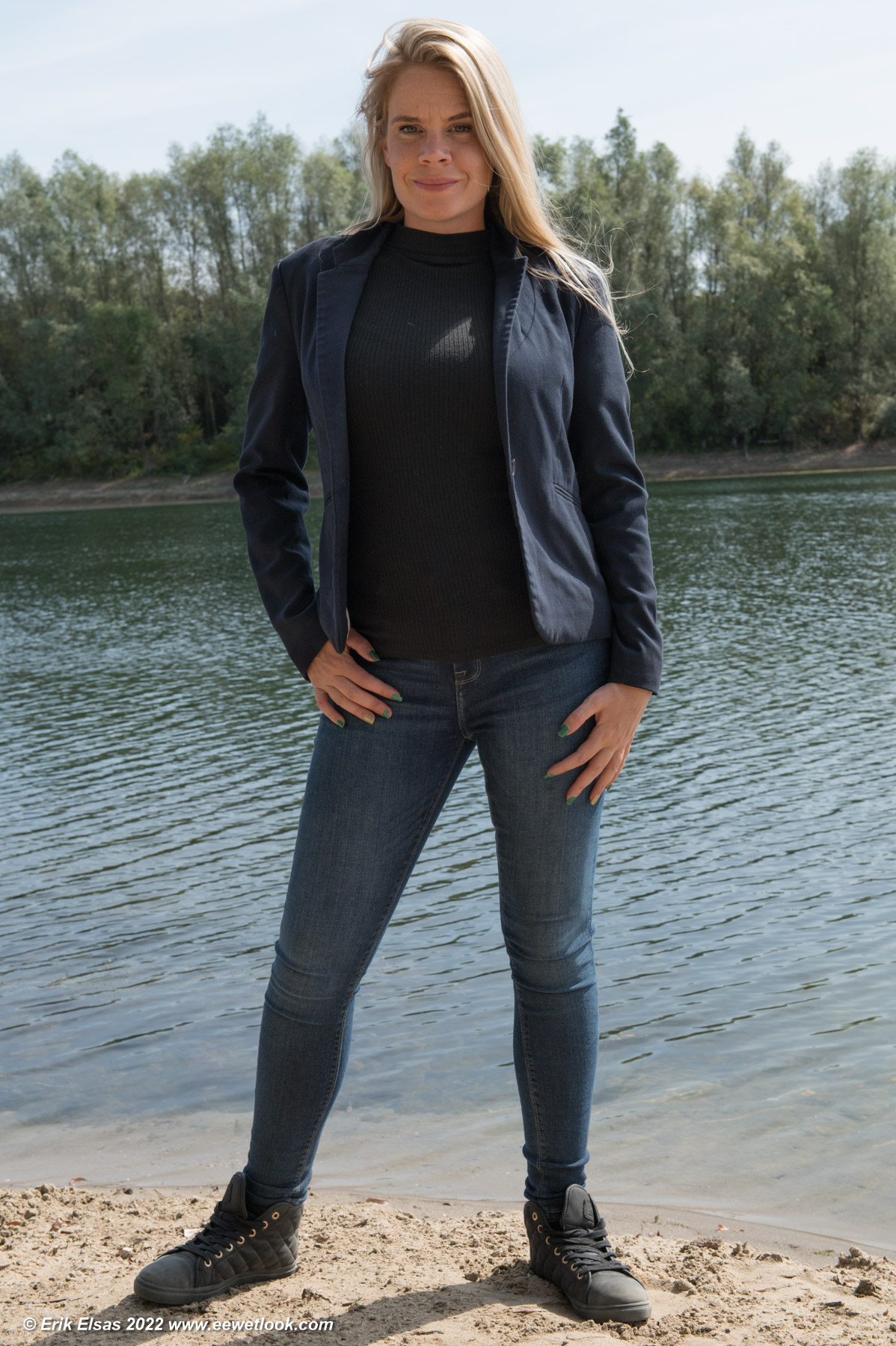 Helena in a lake wearing jeans, a white longsleeve and sports shoes.