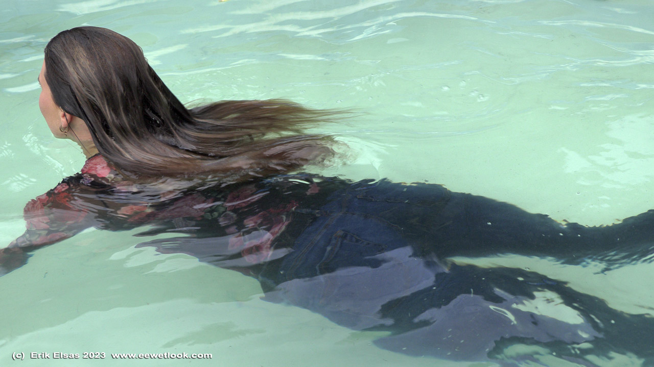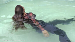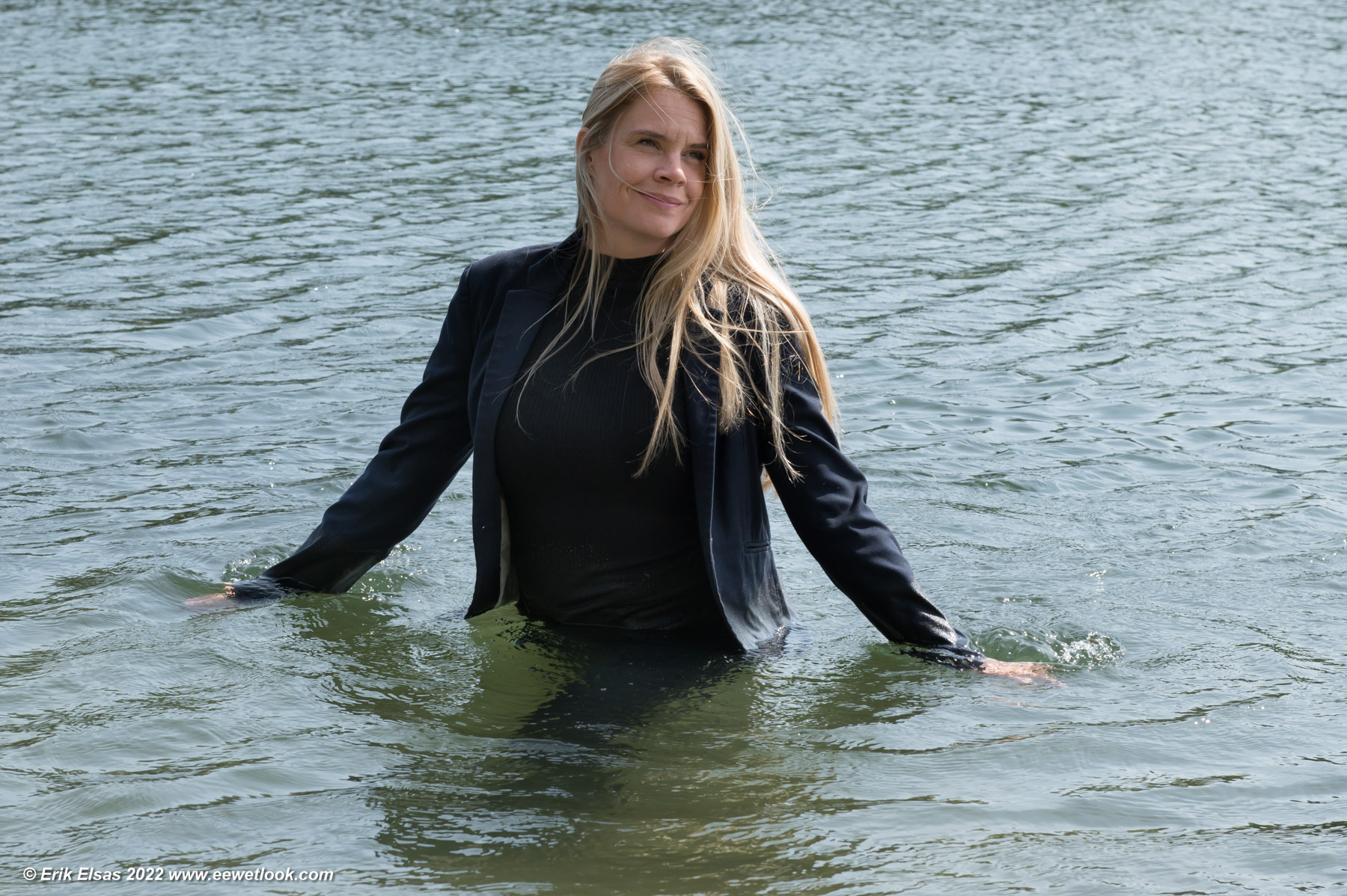 Photoset of Cheranie in a pool, wearing a blazer over a dress, leggings and shoes.