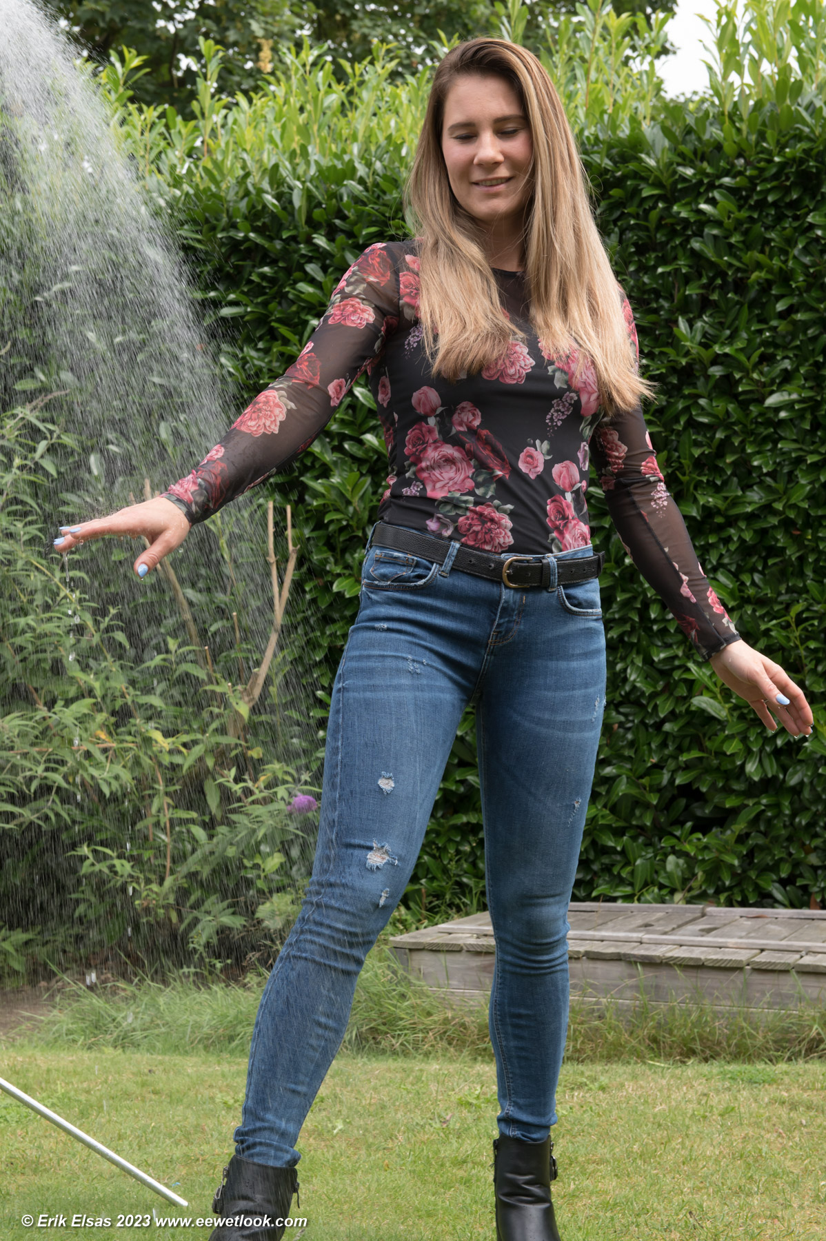 Lotte takes an outdoor shower and a bath in a small pool in a backyard wearing jeans, a tshirt and small boots.