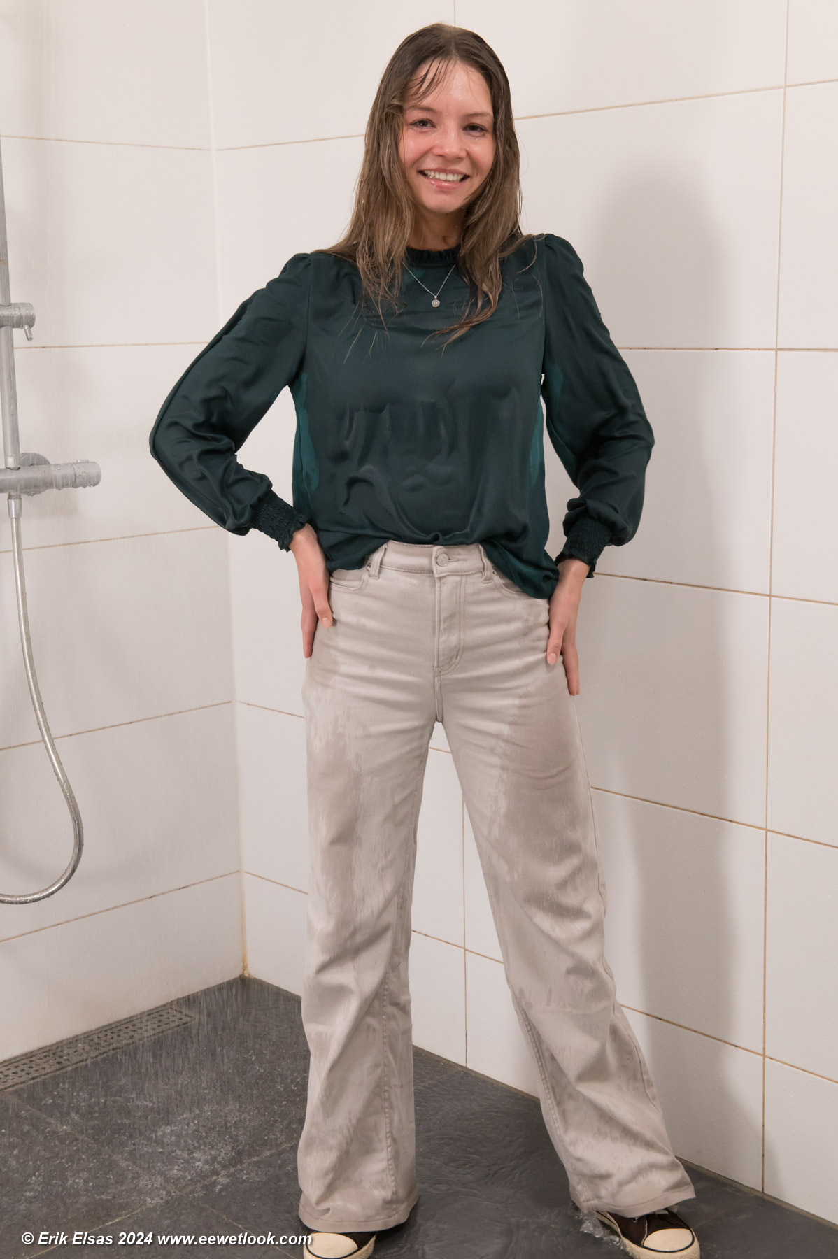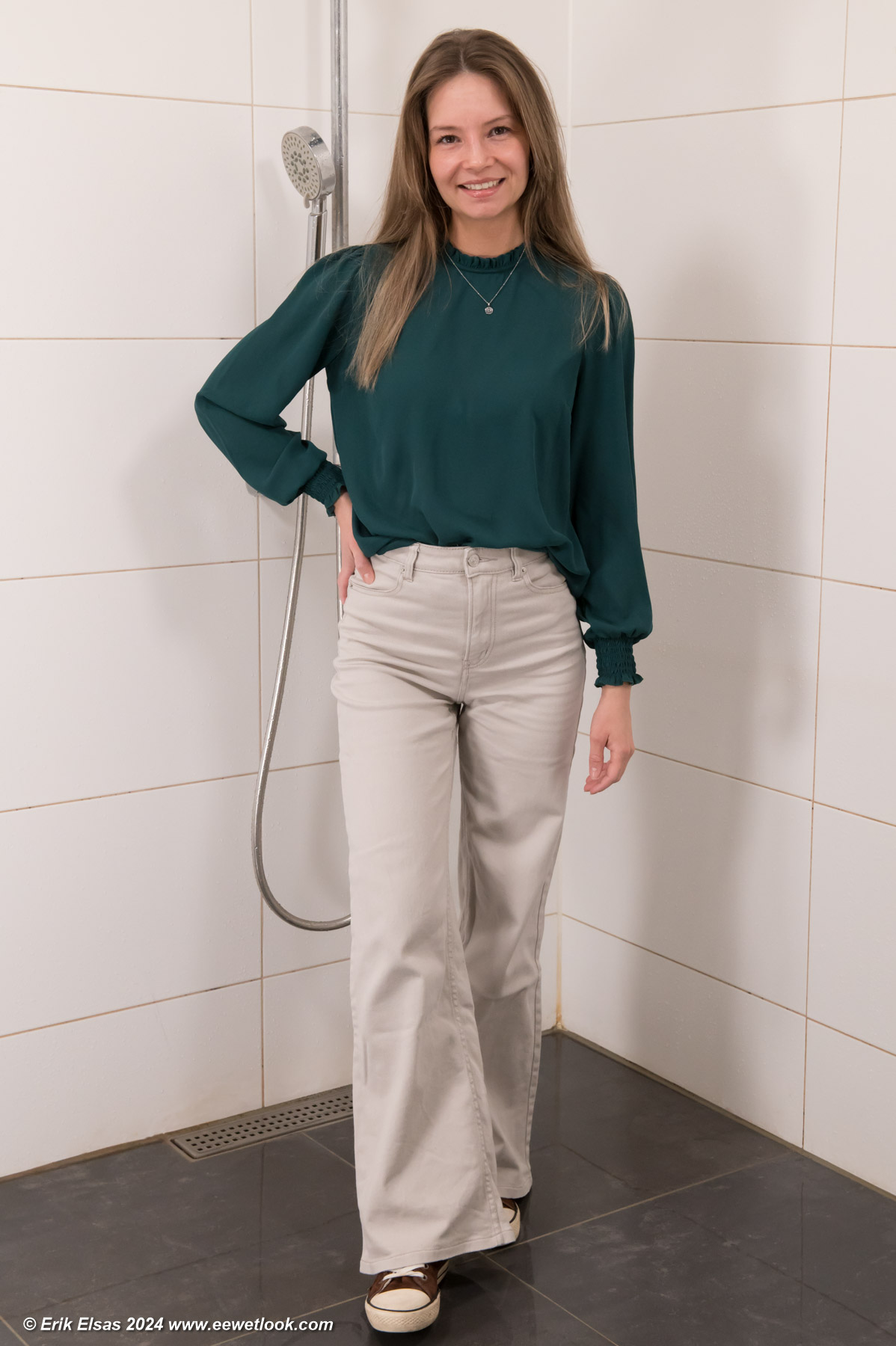 Lisanne in the shower wearing jeans shorts, a blouse, pantyhose and sports shoes.