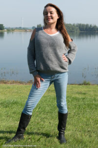 Lotje in a lake on a windy day, wearing jeans, a denim jacket over a longsleeve and sports shoes.