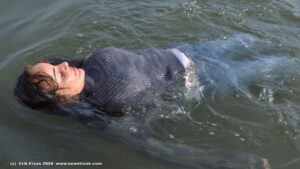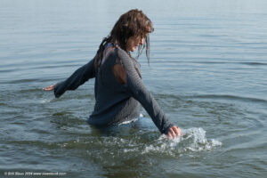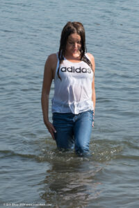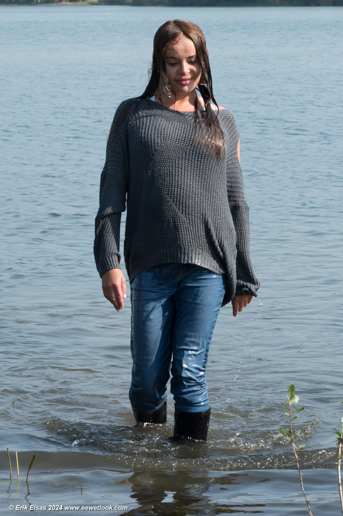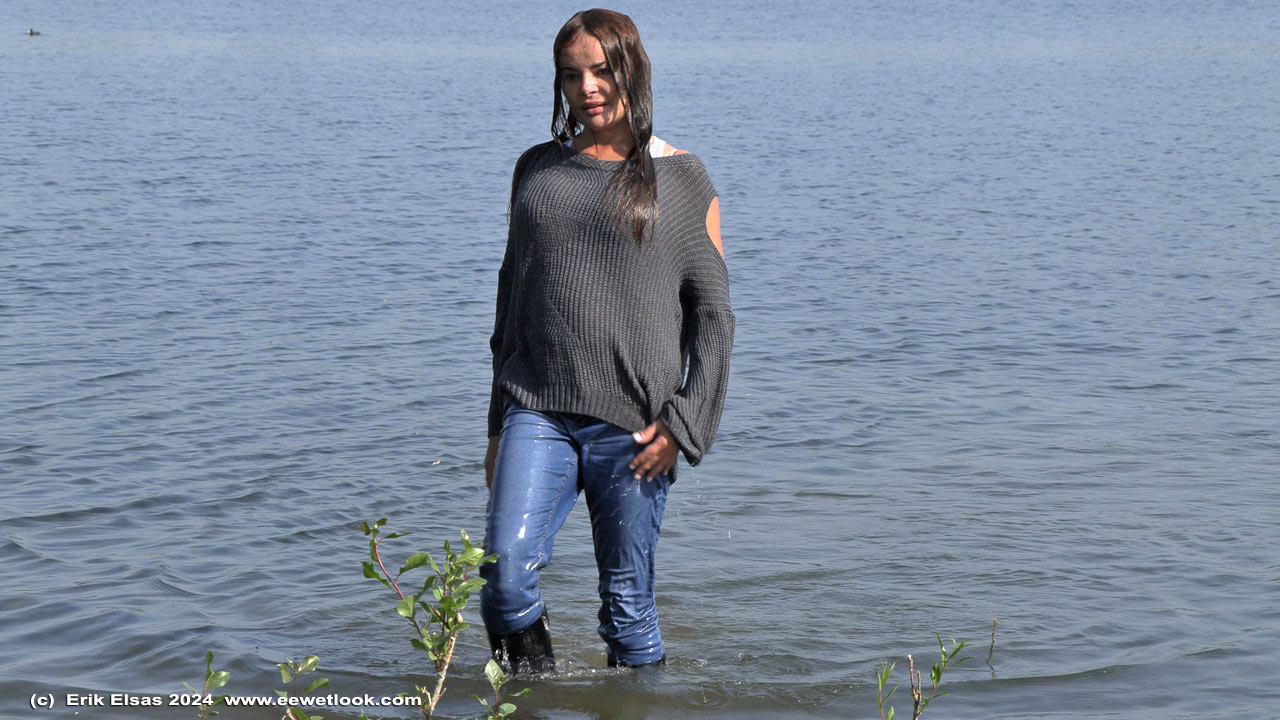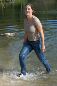 Elisa in a lake, wearing jeans, a blouse and sports shoes.