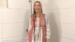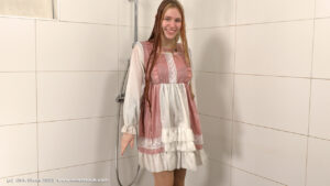 Valeria in the shower, wearing a traditional dress, pantyhose and boots.