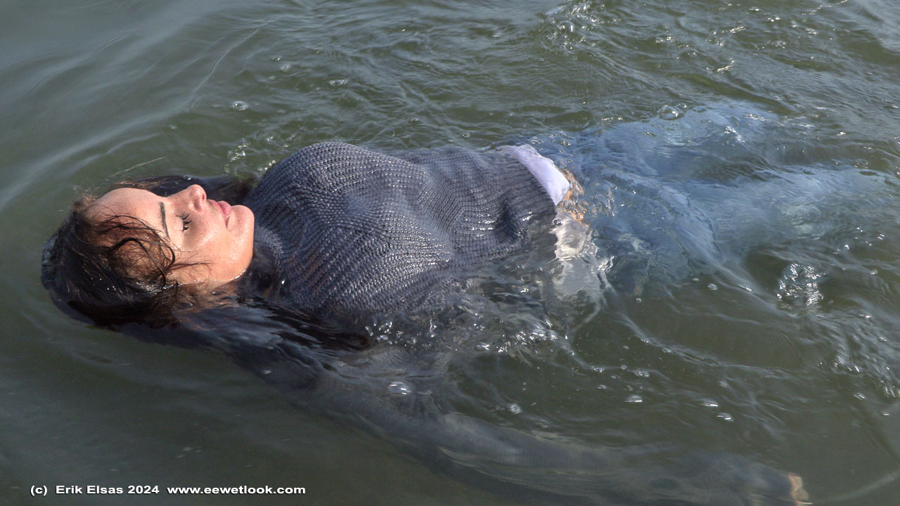 Elizabeth in a lake on a cloudy and cold day, wearing jeans, a blouse and small boots.