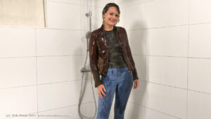Sharon takes a shower, wearing patent leather pants, a longsleeve and boots.